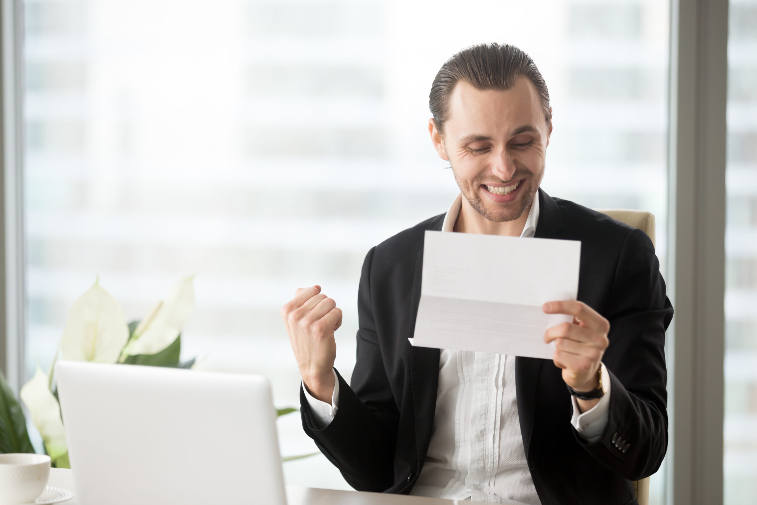 Happy businessman celebrates receiving good business news in let Published 22/12/2025 at 2560 × 1707 in Aguinaldo 2025: Aprende a calcularlo correctamente Happy smiling businessman celebrates receiving good business news in letter while sitting in front of laptop in modern office. Successful deal, bonus or salary raise, financial offer accepted concept. Next →